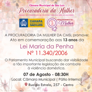 A Câmara Municipal de São Luís, através da sua Procuradoria da Mulher, realizará nesta quarta-feira (07), a partir das 8h30, ato em comemoração aos 13 anos da Lei nº 11.340/06, popularmente conhecida como Lei Maria da Penha.