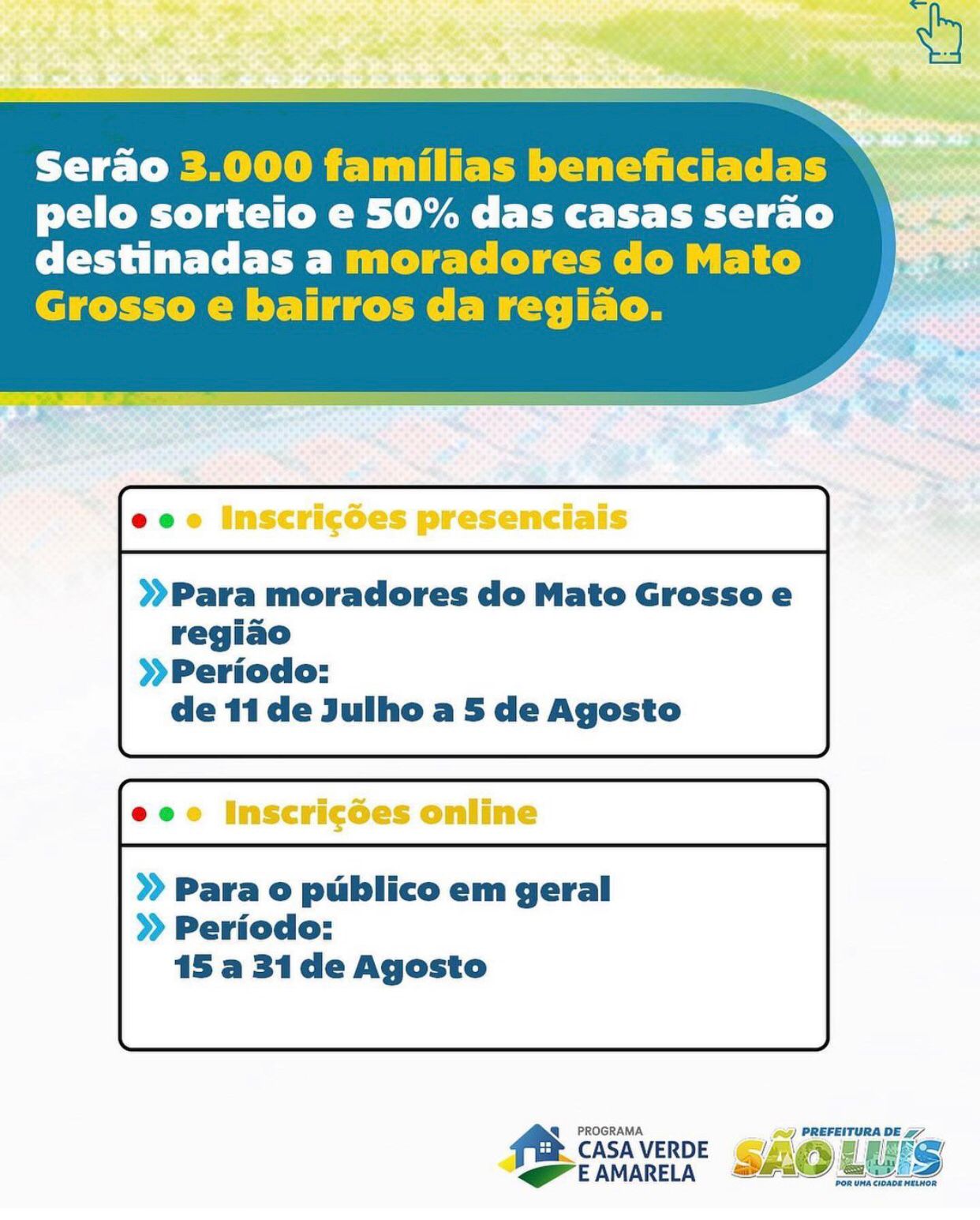 As inscrições para quem está enquadrado nos requisitos básicos e deseja participar do sorteio já estão com as datas previamente definidas. Para moradores do bairro Mato Grosso e região as inscrições presenciais seguem no período de 11 de julho a 5 de agosto. Para o público em geral, as inscrições poderão ser feitas no sistema online de 15 a 31 de agosto.