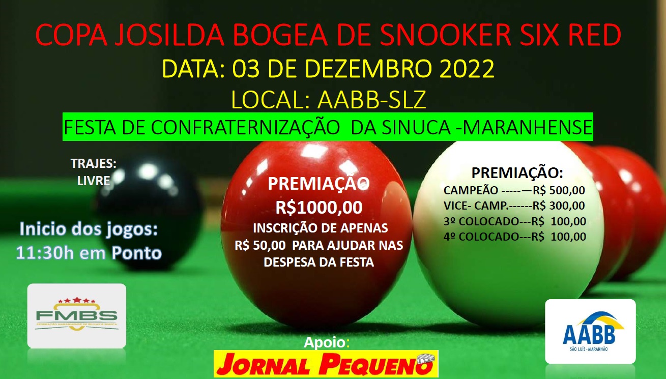 A Associação Atlética Banco do Brasil (AABB-São Luís) e a Federação Maranhense de Bilhar e Sinuca (FMBS), com apoio do Jornal Pequeno, realizarão a Copa Josilda Bogéa de Snooker Six Red e a festa de confraternização da sinuca maranhense neste sábado, 3, a partir das 11h30, no Salão de Sinuca João Bosco, da referida associação. A competição encerra a programação anual da FMBS e da AABB-São Luís e terá a premiação geral de mil reais. Após o encerramento da competição, com a premiação dos vencedores, haverá a festa de confraternização da sinuca.