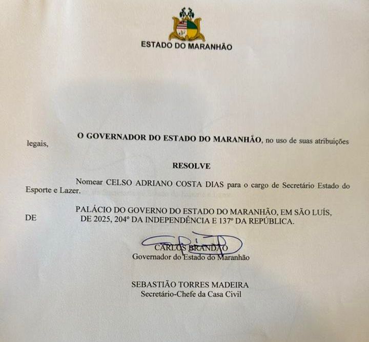 Nesta segunda-feira (14), o governador do Maranhão, Carlos Brandão, nomeou Celso Dias, conhecido como Celsinho, para assumir a Secretaria de Estado do Esporte e Lazer (SEDEL). A indicação para o cargo da movimentada pasta é fruto da articulação do deputado federal Aluisio Mendes, presidente do Republicanos (MA).