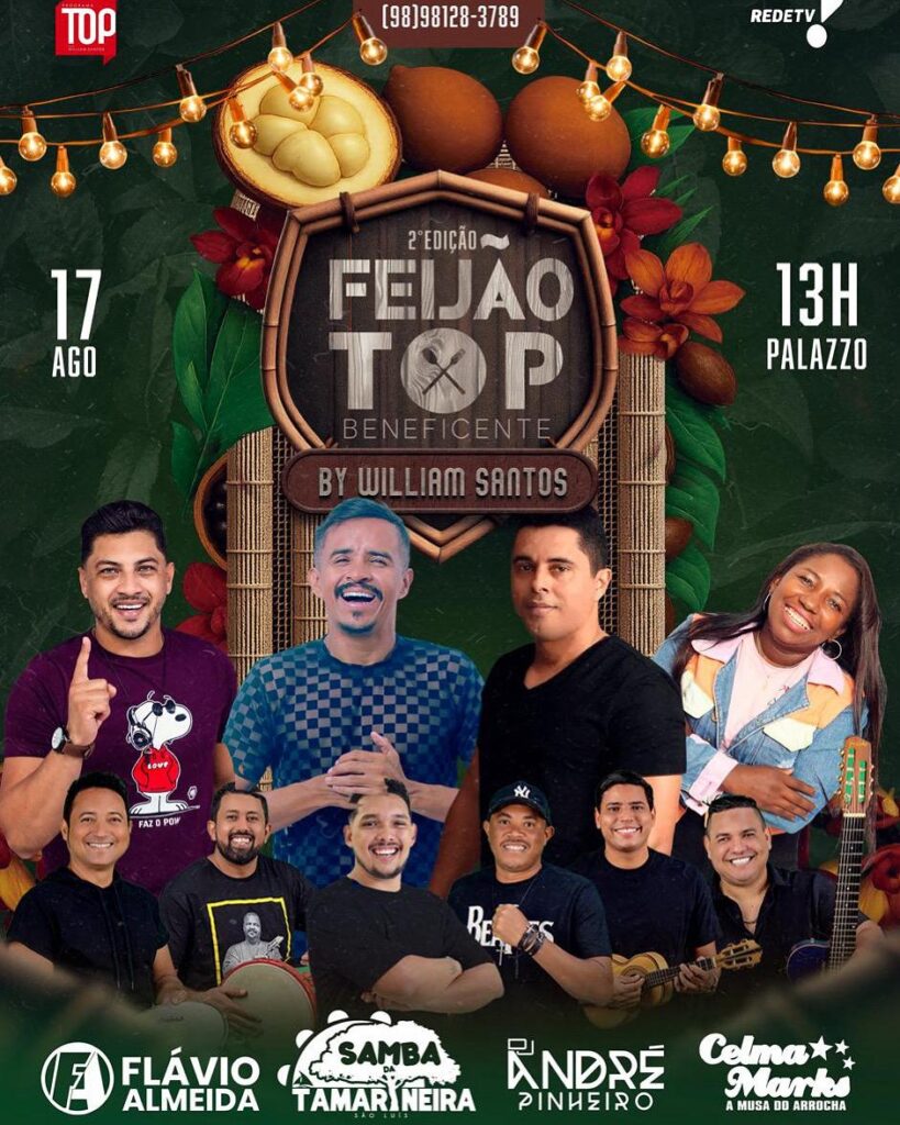O evento contará com apresentações de Flávio Almeida, Samba da Tamarineira, DJ André Pinheiro e Celma Mark, a Musa do Arrocha, garantindo um repertório diversificado que vai do samba ao arrocha. Além da programação musical, o Feijão Top será uma oportunidade de confraternização entre artistas, empresários e convidados especiais, com renda destinada a ações beneficentes.