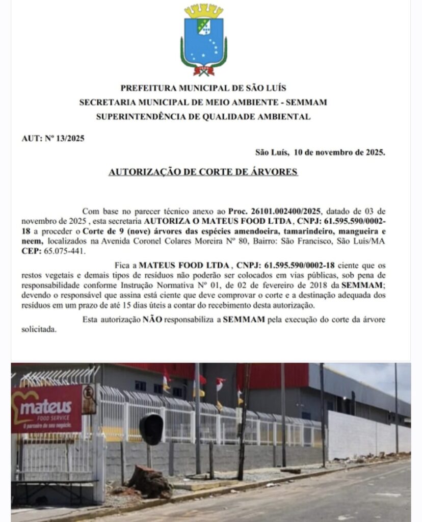 Toda derrubada do verde existente na área foi previamente solicitada pelos interessados, e em seguida, autorizada pela Prefeitura de São Luís, por meio da Secretaria Municipal de Meio Ambiente (Semmam), conforme Autorização de Corte de Árvores N° 13/2025 de 10 de novembro.