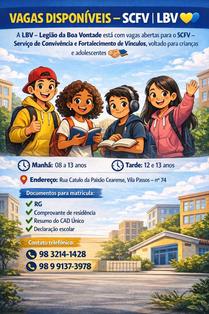A Legião da Boa Vontade (LBV) está com vagas abertas para participação no Serviço de Convivência e Fortalecimento de Vínculos (SCFV), voltado ao atendimento de crianças e adolescentes em situação de vulnerabilidade social em São Luís, no Maranhão.
