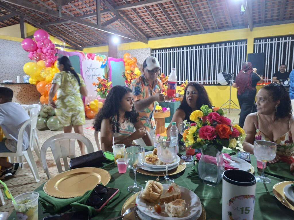 Certamente, pai e as avós materna e partena estão iluminando o acolhedor ambiente, palco da celebração dos 15 anos de Ana Sophia. Debruçados para que tudo acontecesse de forma esplêndida, a mãe, Alexsandra, os tios Márcio e Bernardo, e as tias Sheila, Cristiane e outras que me foge o nome. Ambiente feito e perfeito!