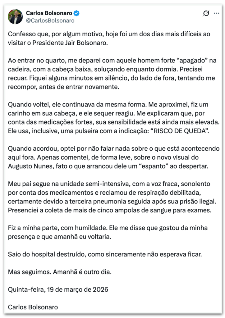 Ao entrar no quarto, me deparei com aquele homem forte ‘apagado’ na cadeira, com a cabeça baixa, soluçando enquanto dormia. (…) Me aproximei, fiz um carinho em sua cabeça e ele sequer reagiu. Me explicaram que, por conta das medicações fortes, sua sensibilidade está ainda mais elevada. Ele usa, inclusive, uma pulseira com a indicação: ‘Risco de queda’”, declarou Carlos em publicação em seu perfil no X.