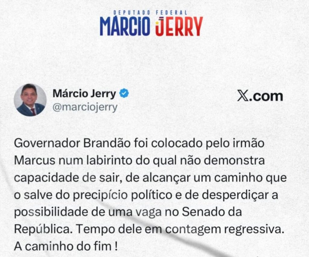 De forma sistemática, o deputado federal comunista Márcio Jerry tem feito declarações nas redes sociais dosadas e especulações sobre o destino do governador Carlos Brandão. Nas entrelinhas, o “tom de Jerry” sugere que algo de muito grave esteja por vir em direção ao governo de “Sertanejo”.