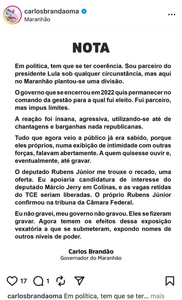 Desde então, surgiram nas redes sociais, uma infinidade de notas e anotações sobre o episódio envolvendo ameaças, pressões e chantagens ao governador Brandão. Tudo devidamente apresentado pelo “médico parlamentar” através de vídeos, áudios e prints.