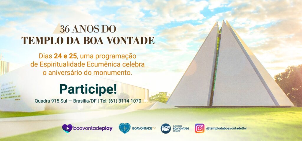 Hoje, 21 de outubro, o Templo da Boa Vontade (TBV) comemora 36 anos de fundação. Conhecido também como a Pirâmide das Almas Benditas, o monumento convida todos a participar de momentos inesquecíveis de profunda renovação espiritual, sob o tema: “A Certeza da Volta do Cristo: ‘Ora vem, Senhor Jesus!’”.