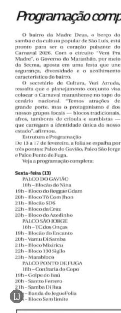 Tudo estava bem definido de acordo com a programação feita pela Secretaria de Estado da Cultura. Pelo ‘Palco Gavião’ passariam diversos blocos carnavalescos, mas na “hora H”, pimba! Tudo foi cancelado.